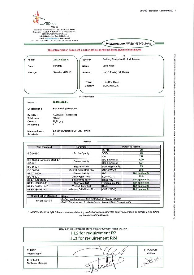 En-Liang's products undergo strenuous testing procedures that meet or exceed the related standards in Taiwan or overseas. En-Liang's full series of high voltage post insulators is tested and approved by the Taiwan Electrical Research Center, making En-Liang the first company in Taiwan to have approved its entire products. In addition, En-Liang's BMC and Epoxy products are approved by UL-94V0 of the US and UL of Canada. In October 1996 En-Liang's 7.2KV high-voltage support insulators are approved after extensive testing by the Technology Research Institute in Osaka, Japan. En-Liang was certified for ISO-9001(2000) in May 2003 and obtained EN45545-2 certification for our BMC material in 2017.
